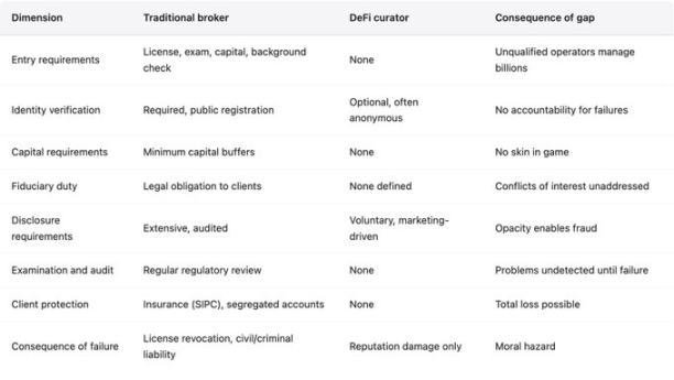 従来の銀行や証券会社は、顧客資金の運用において、資本要件、登録義務、受託者責任、そして規制当局の監視に直面します。一方、DeFiファンドマネージャーは市場インセンティブのみに基づいて業務を行います。これらのインセンティブは、リスク管理よりも資産の蓄積とリターンの最大化を優先します。