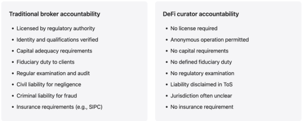 この比較は、キュレーションモデルにおける説明責任メカニズムの欠如を明らかにすることを目的としており、伝統的金融が完璧であるとか、その規制を模倣すべきだと示唆するものではありません。伝統的金融には欠陥がありますが、多大な費用をかけて培われた説明責任メカニズムは、キュレーションモデルによって明確に放棄されています。