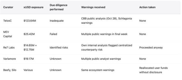 多くのマネージャーは、完全な開示なしにユーザーの資金をxUSDポジションに配置し、預金者を知らないうちにStreamの最大7.6倍のレバレッジとオフチェーンの不透明性のリスクにさらしています。