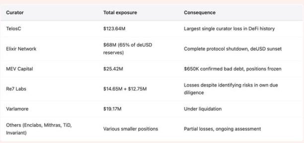 TelosC(1億2,364万ドル)、Elixir(6,800万ドル)、MEV Capital(2,542万ドル)、Re7 Labs(2つの金庫で2,740万ドル)など、複数のファンドマネージャーは、ユーザー預金を単一のカウンターパーティに高度に集中させています。このカウンターパーティは、わずか190万ドルの実質担保で、最大7.6倍のレバレッジをかけて運用しています。