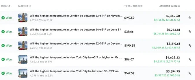 「automatedAItradingbot」というアカウントが2025年1月にPolymarketに参入しました。このアカウントは天気予報への賭けに特化し、7万ドル以上を稼ぎました。また、ロンドンの天気予報市場のみで取引を行うボットを発見した人もおり、このボットは1年足らずで1,000ドルを24,000ドルに増やしました。