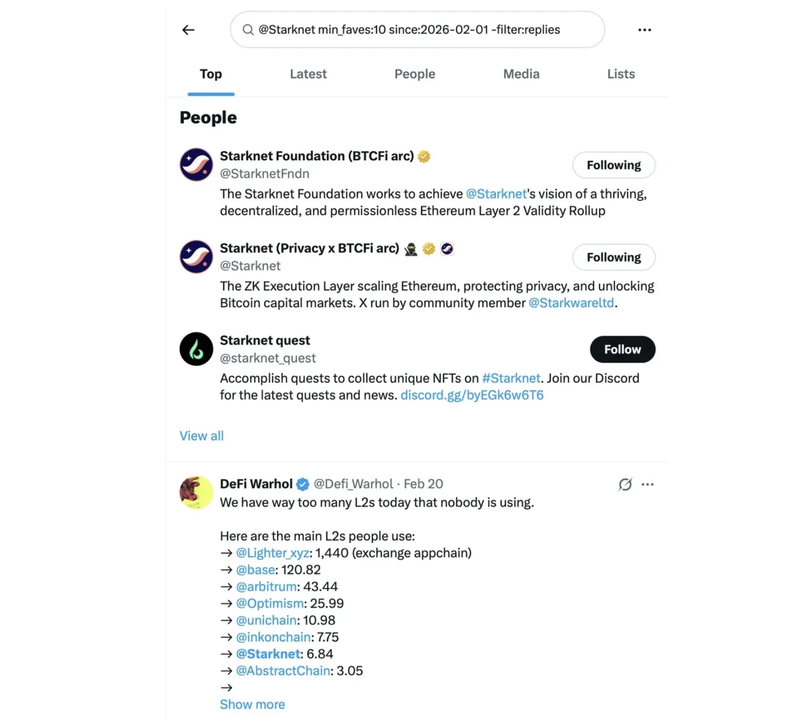 Xでシンプルなフィルターを使って、2月にStarknetに言及している上位の投稿を見てみると、結果は明らかです。