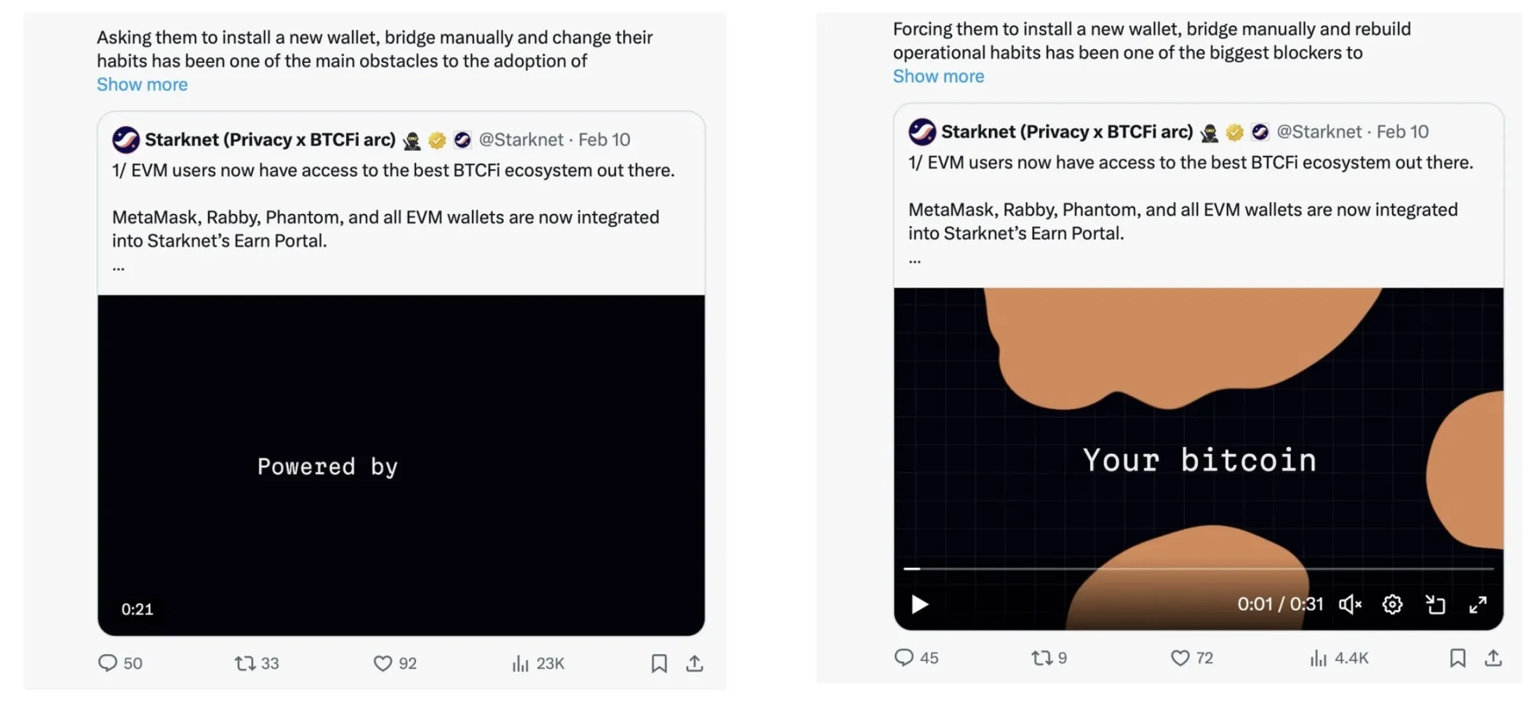 Starknetは最近strkBTC [₿]をローンチし、Xプラットフォーム上のコンテンツクリエイター数名をキャンペーンのプロモーションに招待しました。彼らは非常に古典的なプロモーションモデルを採用しました。
