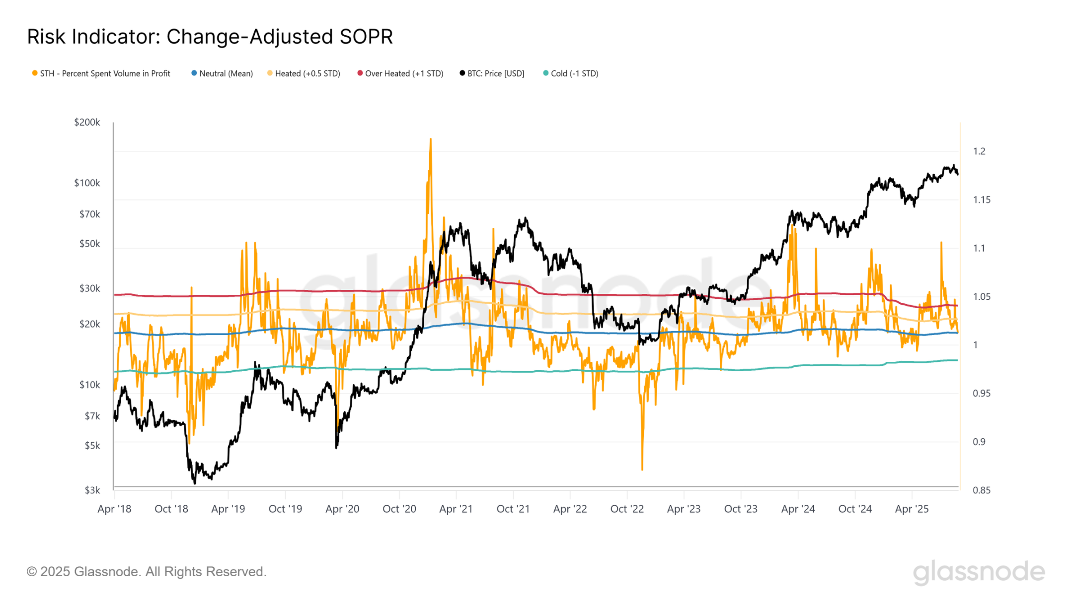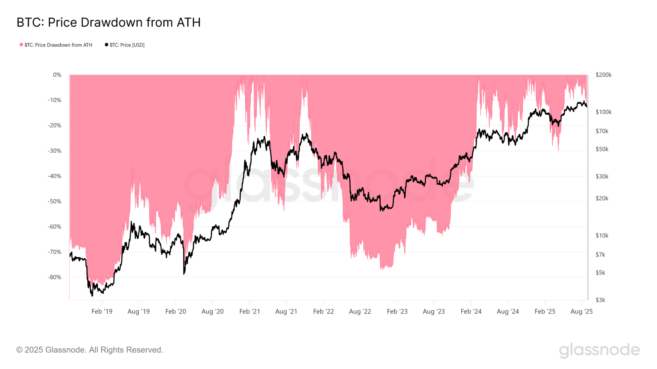 これまでのところ、110,100ドルへの直近の下落は、史上最高値124,000ドルから約11.4%のリトレースメントを示しています。過去の中期的な弱気相場(通常は25%を超える)や深い循環的な安値(75%を超える損失)と比較すると、現在の下落ははるかに緩やかです。こうした状況において、現在の調整の強さは比較的緩やかであり、歴史的な極端な局面で見られた圧力状況にはまだ近づいていません。