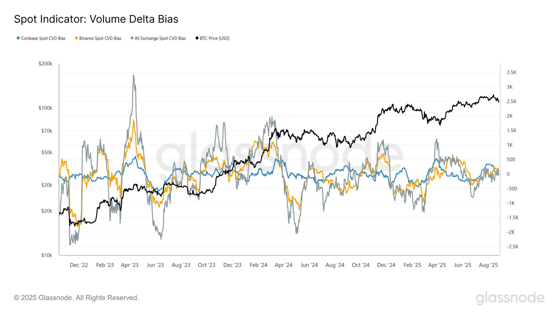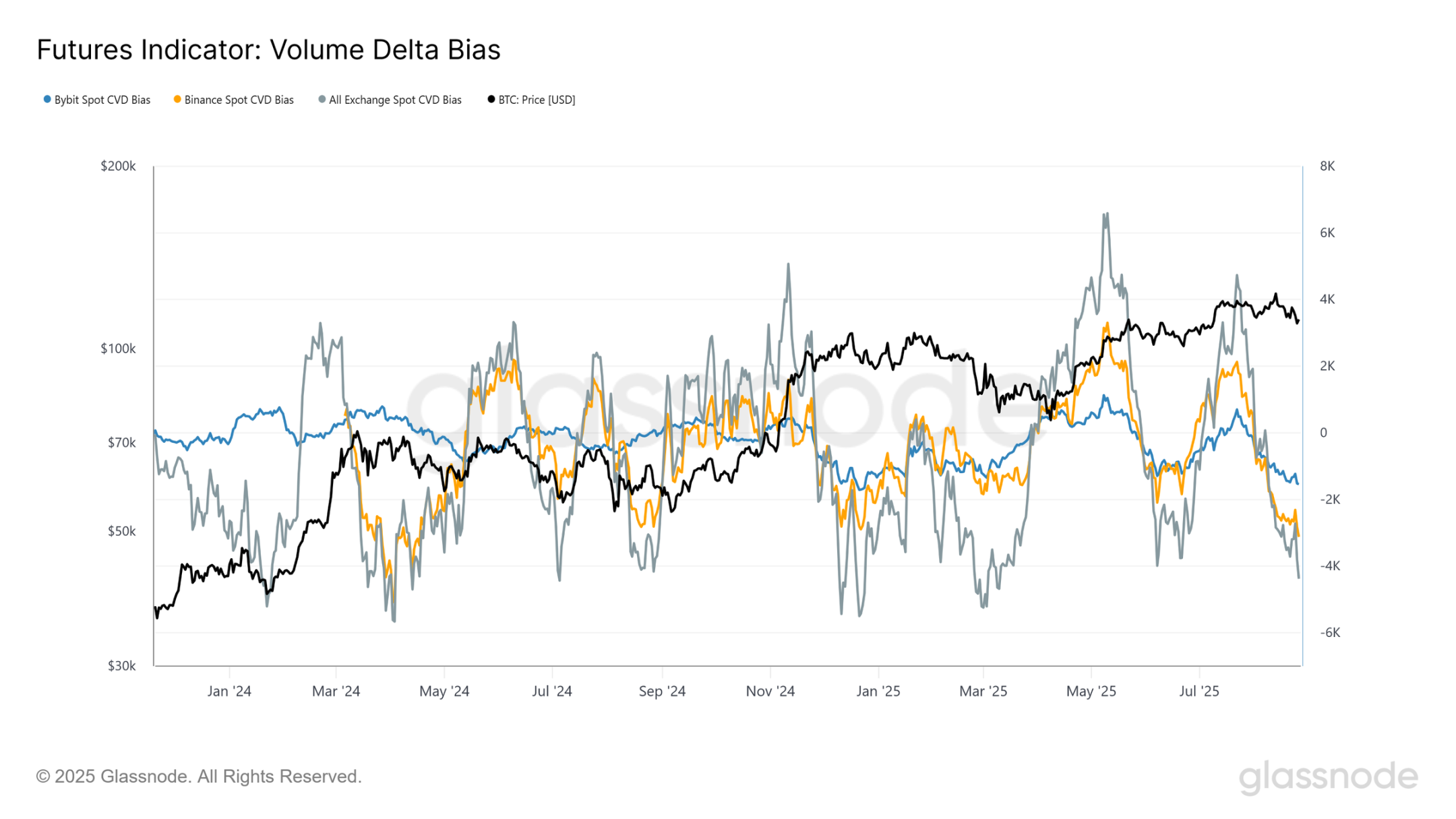 スポット市場の動向の変化を測るため、CVDの30日移動平均と180日中央値を比較します。このバイアスは、CoinbaseやBinanceといった主要取引所、そして取引所全体のフロー全体で最近ゼロに収束しています。これは、2025年4月に観測された強い買い圧力からの顕著な変化を示しており、この圧力は72,000ドルからの上昇を牽引しました。7月のわずかな反落は124,000ドルへの上昇を後押ししましたが、現在の全体的なトレンドはスポット市場のセンチメントが中立的傾向にシフトしていることを反映しており、現在の水準では買い手の確信が弱まっていることを示唆しています。