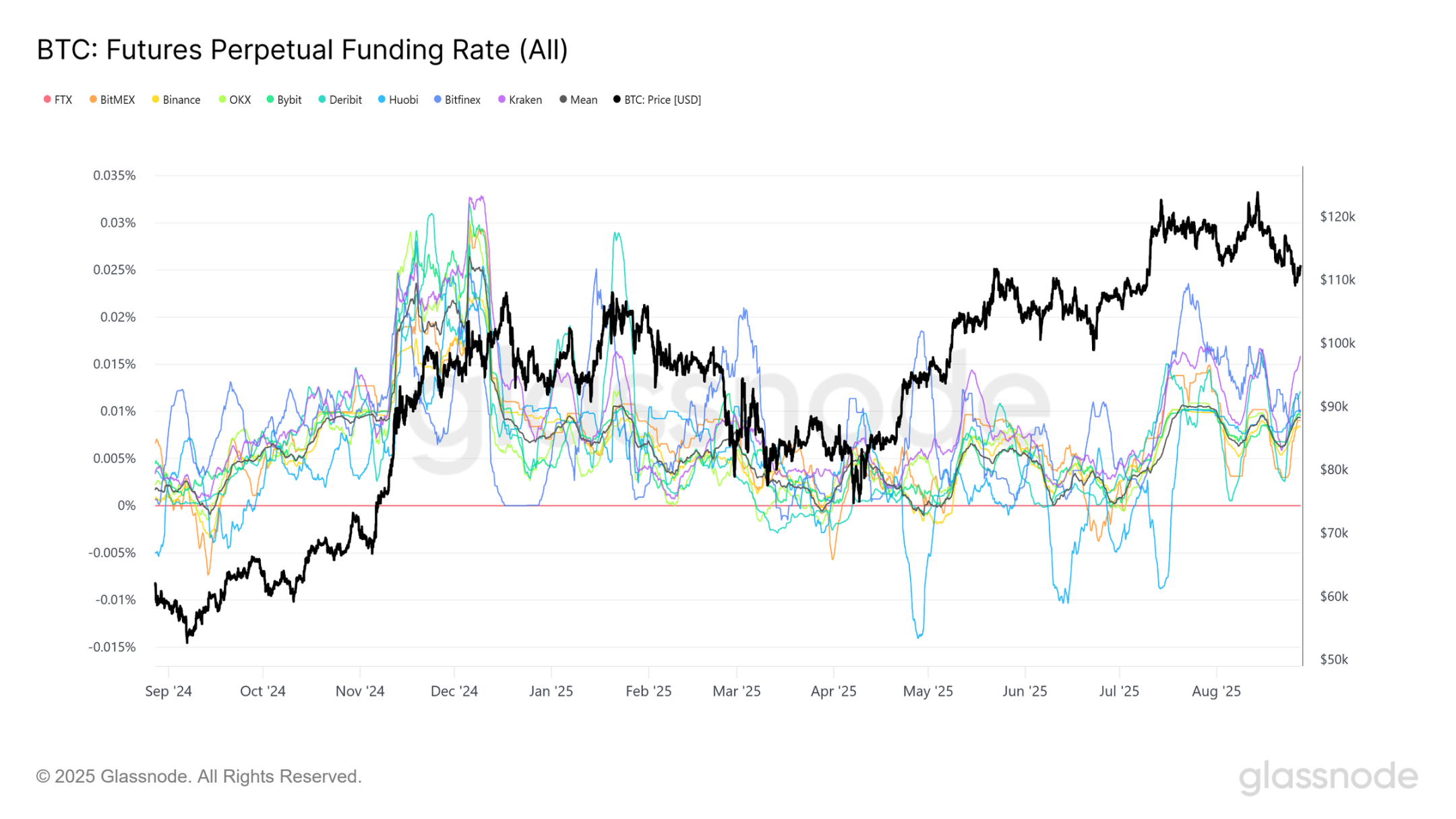 パーペチュアル市場におけるより広範なセンチメントを把握するために、CVD分析と、ロングポジションとショートポジションの保有コストを追跡する資金調達率を組み合わせることができます。主要取引所の7日移動平均資金調達率は現在、約0.01%です。
