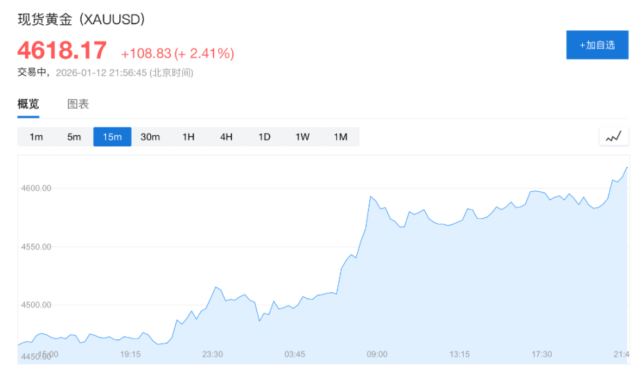 米国司法省によるジェローム・パウエル連邦準備制度理事会(FRB)議長に対する捜査は、FRBの独立性に対する懸念を引き起こし、安全資産としての需要が急増しました。その結果、スポット金価格は1オンスあたり4,620ドルを超え、過去最高値を更新しました。1日の上昇率は2.4%でした。ドル、米国株先物、米国債はいずれも下落し、市場では「アメリカ株を売ろう」というセンチメントが再び高まりました。