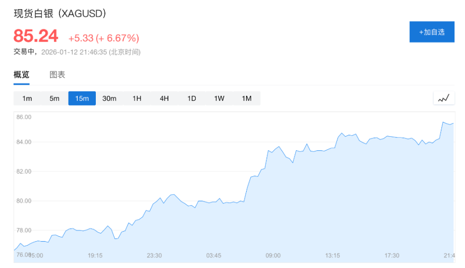 貴金属価格は急騰し、次々と最高値を更新した。スポット金は1オンスあたり4,620ドルを超え、日足では2.44%上昇し、年初来では300ドル以上上昇した。スポット銀は7%上昇し、過去最高の85.24ドルを記録した。