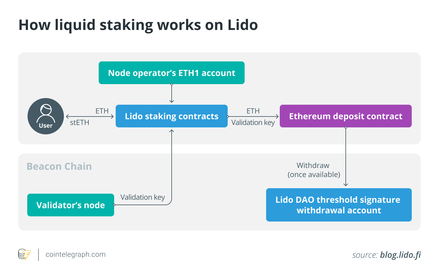 Lidoはスマートコントラクトベースのステーキングプールです。ユーザーはプラットフォームに資産を預け入れ、その資産はプロトコルを通じてLidoブロックチェーンにステーキングされます。Lidoでは、ETH保有者が最低ステーキング量である32ETHの一部をステーキングすることで、ブロック報酬を獲得できます。Lidoのステーキングプールのスマートコントラクトに資金を預け入れると、ユーザーはLido Staked ETH(stETH)を受け取ります。stETHはERC-20互換トークンで、預け入れ時に生成され、引き出し時に破棄されます。