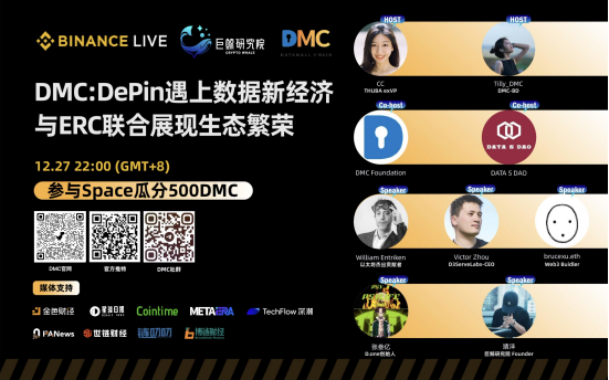 このAMAに、DMCとDATA S DAOは光栄なことに、D3ServeLabsのCEOであるZhou Zainan氏、イーサリアムへの傑出した貢献者であるWilliam Entriken氏、LX DAOの創設者であるBruce氏、D.oneの創設者であるSanyi氏、Giantの創設者であるJingfeng氏を招待します。 Whale Research Institute 5 人のゲストが、新しいデータエコノミー時代に DePIN が ERC エコシステムとともにどのように繁栄するかについて話し合いました。