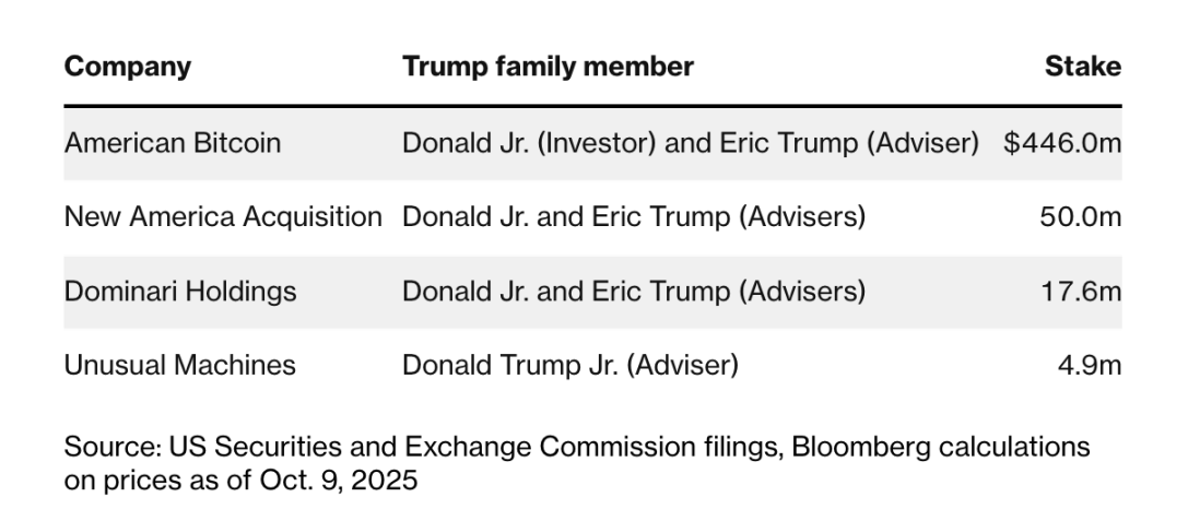 10月9日時点で、トランプ兄弟のドミナリ株の価値は1,700万ドル以上だった。ドミナリが設立を支援したビットコイン採掘会社におけるエリックの株の価値は約5億ドルで、トランプ家の基準から見ても巨額の富だ。