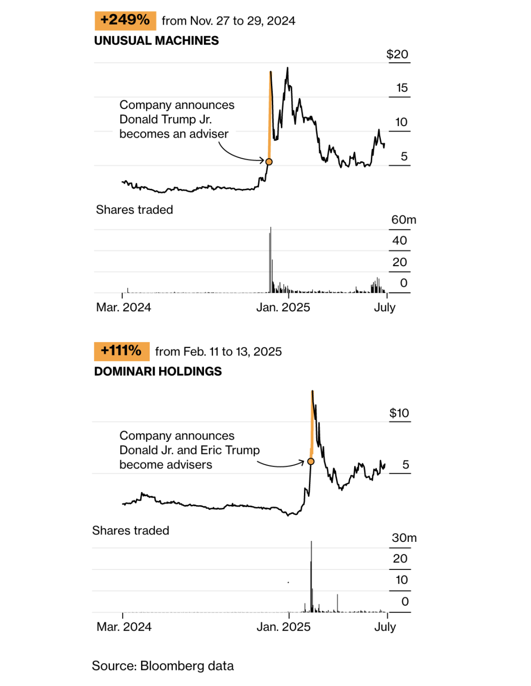 それ以来、トランプ一族をこれまで知られていなかった株に結びつけ、その結果生じる露出を利用して株価を吊り上げるという、同様の協力関係が次々と生まれている。