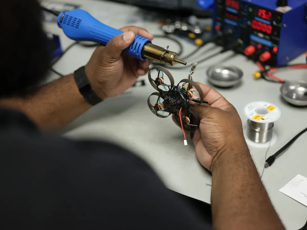Unusual Machines で作業員がドローンの部品を組み立てている。
