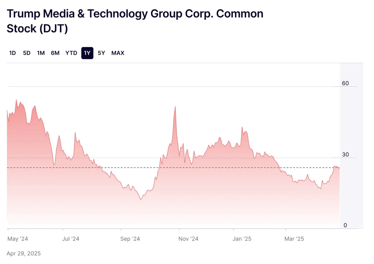 この「草の根企業」は、トランプ大統領が2021年1月に主要ソーシャルメディアプラットフォームで発言権を剥奪された後、カリフォルニア州選出の下院議員デビン・ヌネス氏と60万人の支持者が共同出資して設立した。2024年3月26日に上場して以来、「ミーム」株と呼ばれ、株価はトランプ大統領の影響でほぼ変動している。 2024年度通期財務報告では、通期純損失が4億100万ドルだったことが明らかになった。製品の不完全さと強力な競争相手、数ヶ月にわたる損失とユーザー数の伸び悩みにより、同社の株価は一時4分の1に下落した。