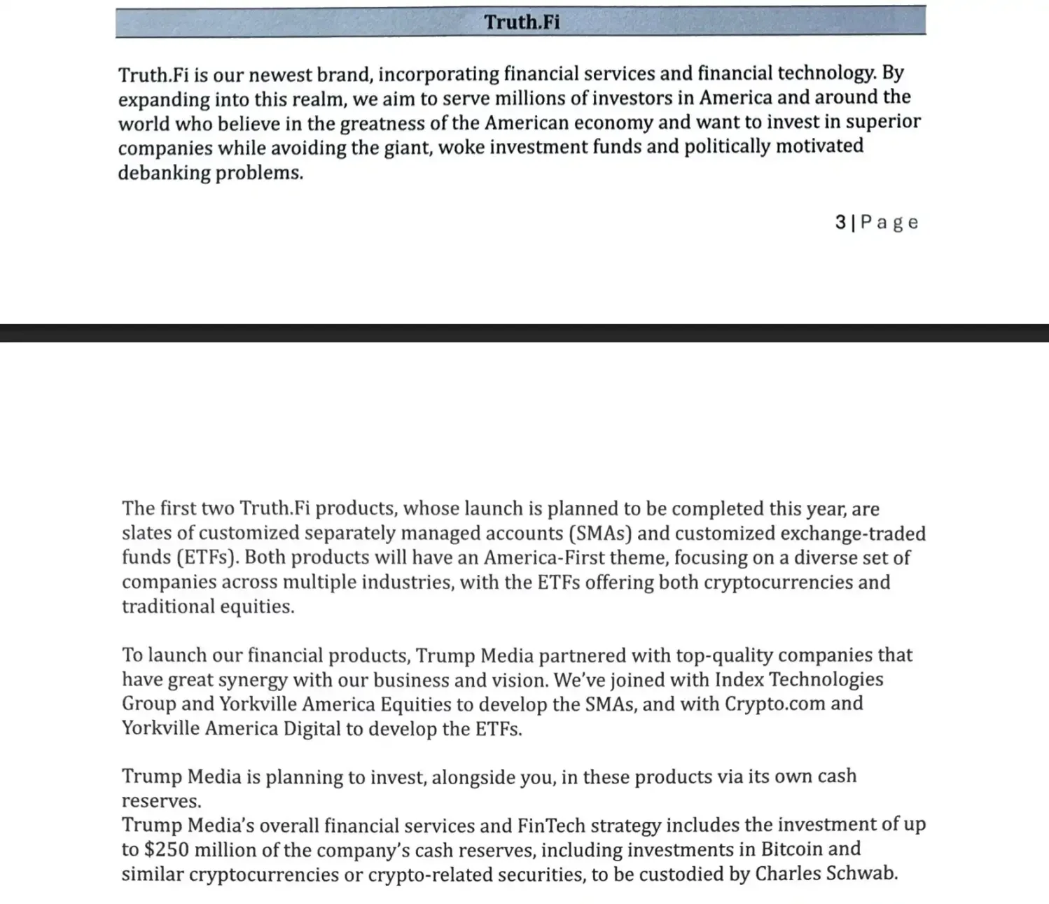 Truth.Fiが今年発売を計画している最初の2つの製品は、Index Technologies GroupおよびYorkville America Equitiesと提携して開発されたカスタマイズされた個別管理口座(SMA)と、Crypto.comおよびYorkville America Digitalと提携して開発されたカスタマイズされた上場投資信託(ETF)です。 ETF事業は暗号通貨と従来の株式の両方をカバーします。