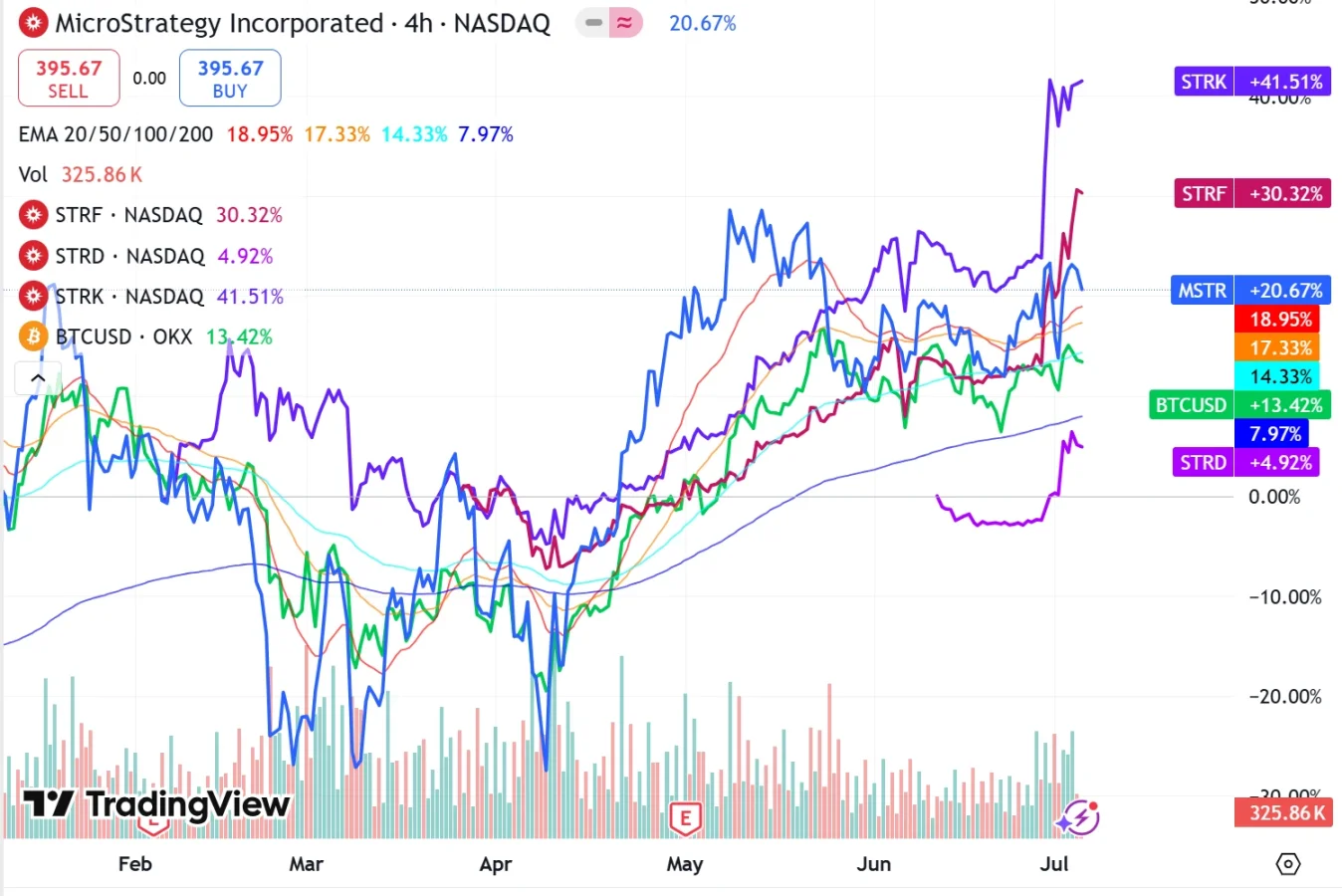 市場パフォーマンスの観点から見ると、マイクロストラテジー(MSTR)はビットコイン自体を大幅に上回っており、特に最近の「暗号米国株」ブームの影響が顕著です。先行発行の優先株STRKとSTRFも市場で非常に好調なパフォーマンスを示しており、後発のSTRDも高い潜在性を示しています。価格動向の観点から見ると、STRKとSTRFは特に最近好調で、MSTRの株価パフォーマンスを大きく上回っています。