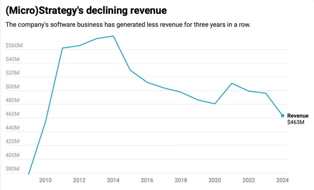 収益面から見ると、同社自身の「血液製造」能力は弱い。@0x ChainMindのデータによると、同社の2024年のソフトウェア事業の収益はわずか4億6,300万米ドルで、2010年以来の最低記録となった。