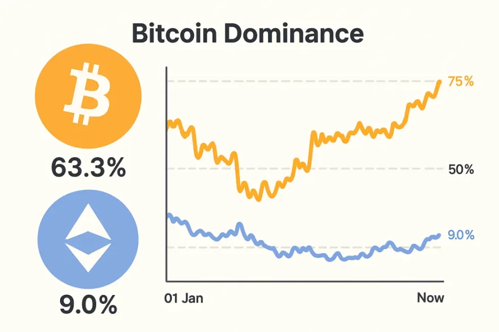 過去1年間、暗号化デジタル通貨分野におけるビットコインの時価総額の優位性は拡大し続け、現在では過去5年間で最高値の63%を超えています。