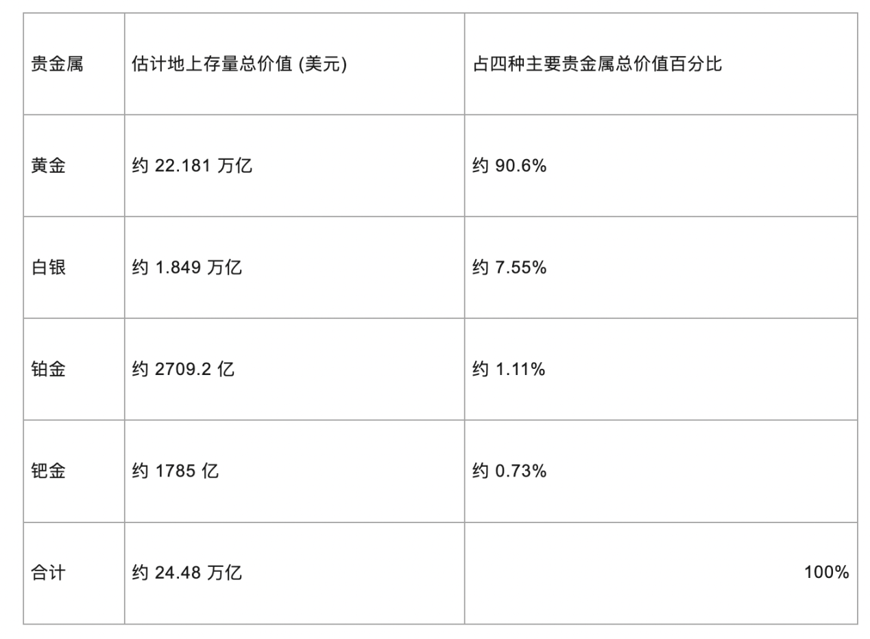最も明白に思い浮かぶのは、もちろん金です。 ChatGPTとGeminiに貴金属の市場価値分布を調査してもらいました。その結果は次の表のとおりです。