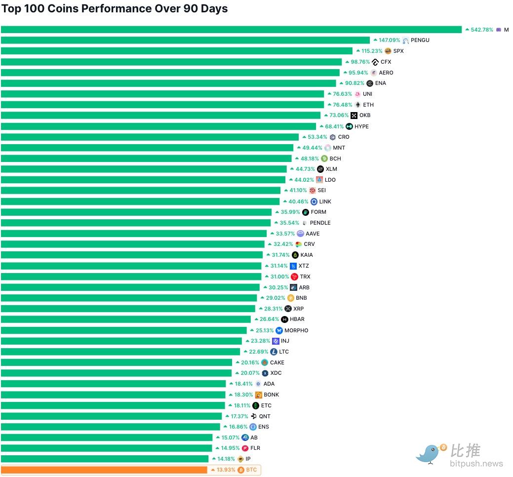 MNT(+49.06%)やARB(+30.52%)といったレイヤー2/スケーリングセクターの代表的なプロジェクトは、イーサリアムのエコシステムの活性化とオンチェーン取引量の増加の恩恵を受け、レイヤー2ネットワークの評価ロジックを活性化させています。低手数料と高スループットを求めるユーザーニーズが高まる中、レイヤー2はパフォーマンス最適化ソリューションであるだけでなく、様々な新しいプロトコルの起爆剤にもなっています。一部の投資家は、これらの基盤セクターは「緩やかな強気相場」の特徴を備えていると考えています。ミームのような短期的な回復力はないかもしれませんが、堅牢なエコシステムと長期的なナラティブという点で優位性があります。