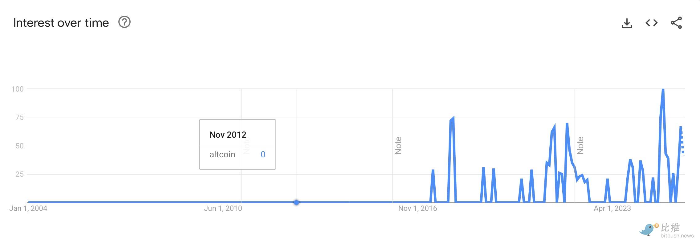Googleトレンドのデータによれば、「アルトコイン」の検索人気は5年ぶりの高水準に達し、「イーサリアム」の検索ボリュームは2年ぶりの高水準に達した。