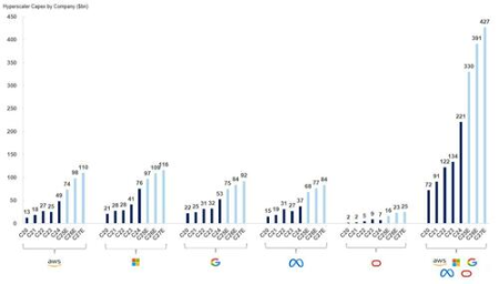 人工知能(AI)関連分野も力強い勢いを見せています。スキアボーネ氏の推計によると、米国のハイパースケールデータセンター事業者の総設備投資額は、2022~2024年度に約4,770億米ドルに達し、2025~2027年度には1兆1,500億米ドルに増加すると予想されており、将来の技術に対する確固たる自信を浮き彫りにしています。
