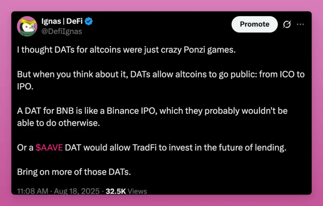 それだけでなく、少数のアルトコイン チームが DAT を発行する専門能力を持っているため、DAT は市場の注目を何百万ものトークンから少数の重要な資産に再び向けさせることもできます。