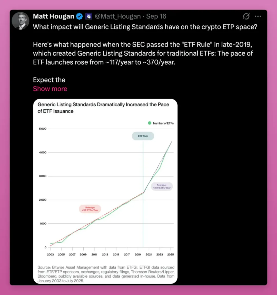 米国株式市場でも同様の普遍的なルールが導入され、2019年にはETFの発行が3倍に増加しました。この傾向は仮想通貨分野でも繰り返されると予想されており、今後はSOL、HYPE、XRP、DOGEなどの資産をターゲットとしたETFが多数登場し、個人投資家に十分な出口流動性を提供することになるでしょう。