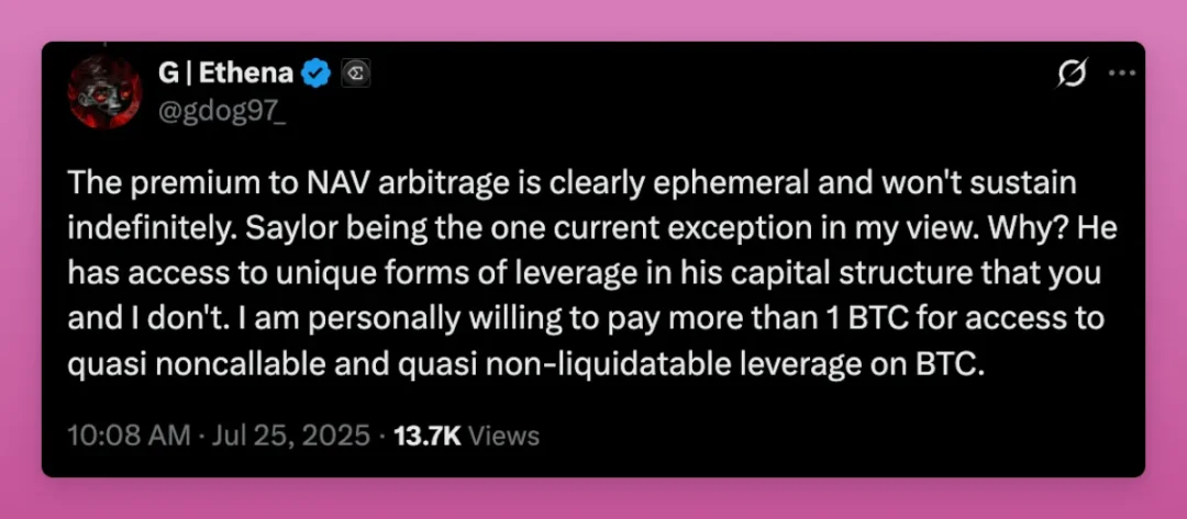 マイケル・セイラー(マイクロストラテジーの創業者)を除けば、ほとんどのDATは純資産価値に対するプレミアムを長期的に維持するのに苦労しています。DATの真の価値はプレミアムではなく、アクセスにあります。安定した資金流入で純資産価値の1:1を維持するだけでも、株式市場から完全に遮断されるよりはましです。