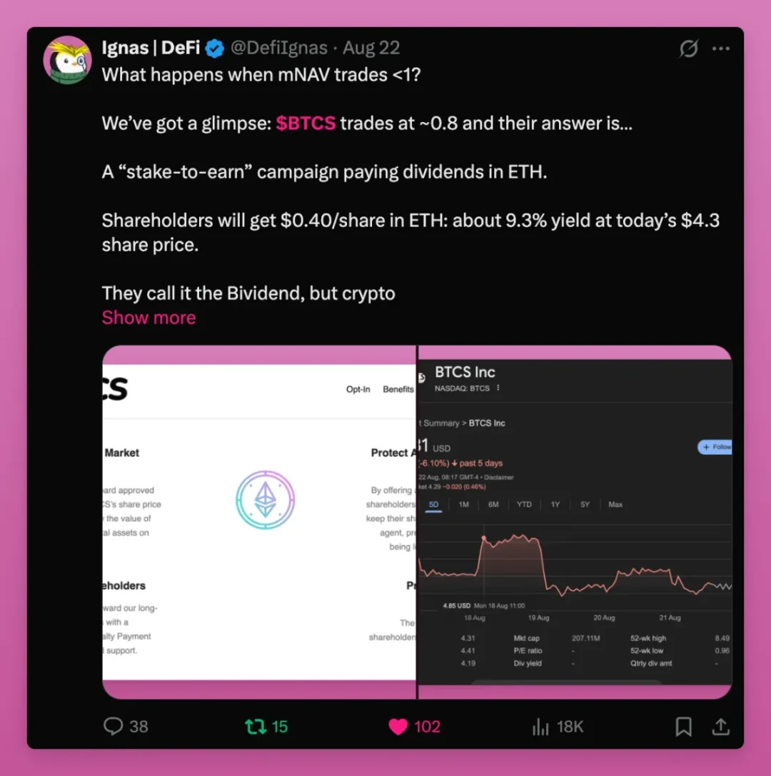最近、市場純資産価値(mNAV)が1を超えるケースが見受けられます。簡単に言えば、DATは株主にイーサリアムを分配しますが、株主はこれを売却する可能性が高くなります。準エアドロップ作戦にもかかわらず、DATトークンであるBTCSは依然として市場純資産価値の0.74倍でしか取引されておらず、これは好ましい状況とは言えません。