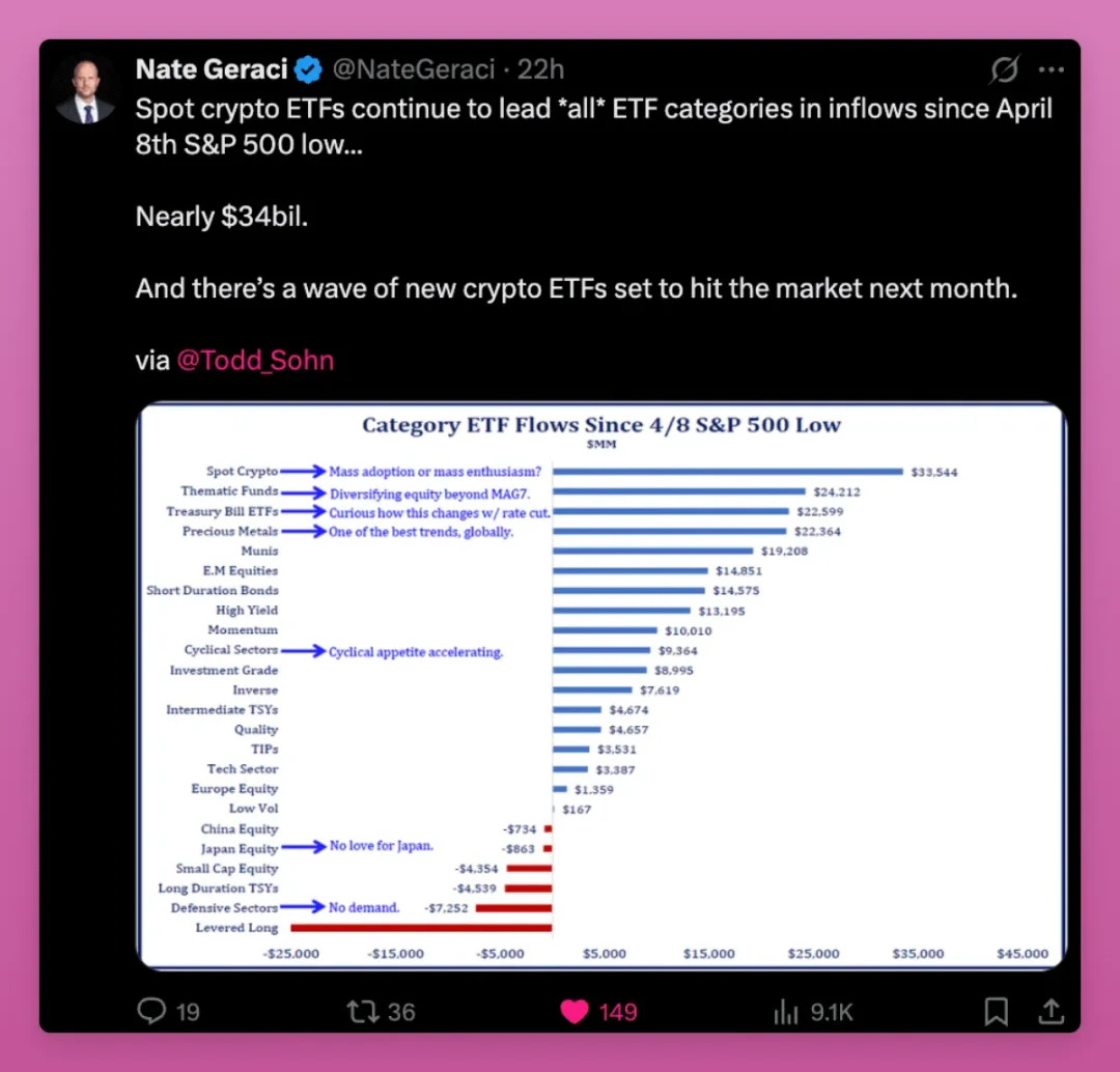 4月8日以降、暗号通貨スポットETFには340億ドルの流入があり、すべてのETFカテゴリーのリストでトップとなり、テーマ別ETF、国債ETF、さらには貴金属ETFを上回った。