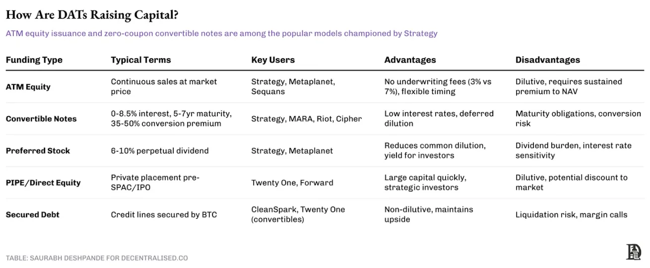 これまで、DAT は 5 つの異なる資金調達方法を採用してきましたが、そのうち 4 つは Strategy によって使用されています。