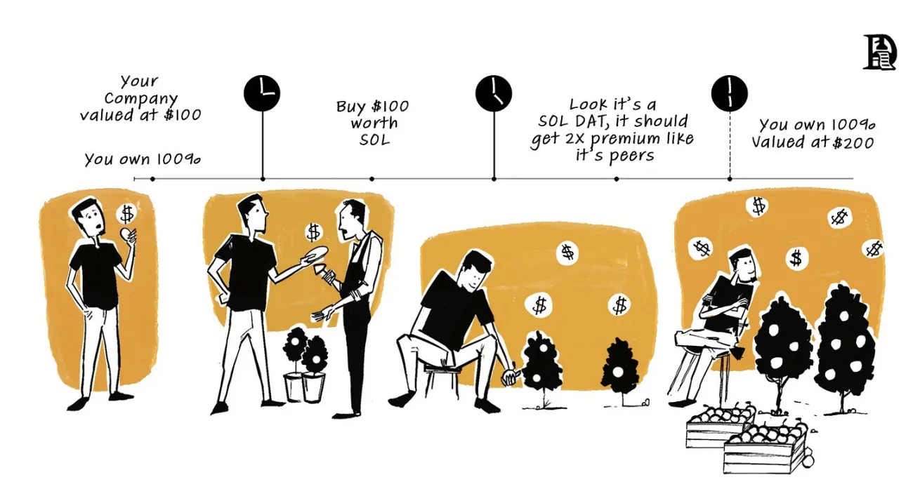 Solana Treasury会社を設立したいとします。会社の価値は100ドルで、あなたはその株式の100%を所有しています。その100ドルを使ってSolanaを購入します。これで、100ドル相当のSolana DATを所有することになります。