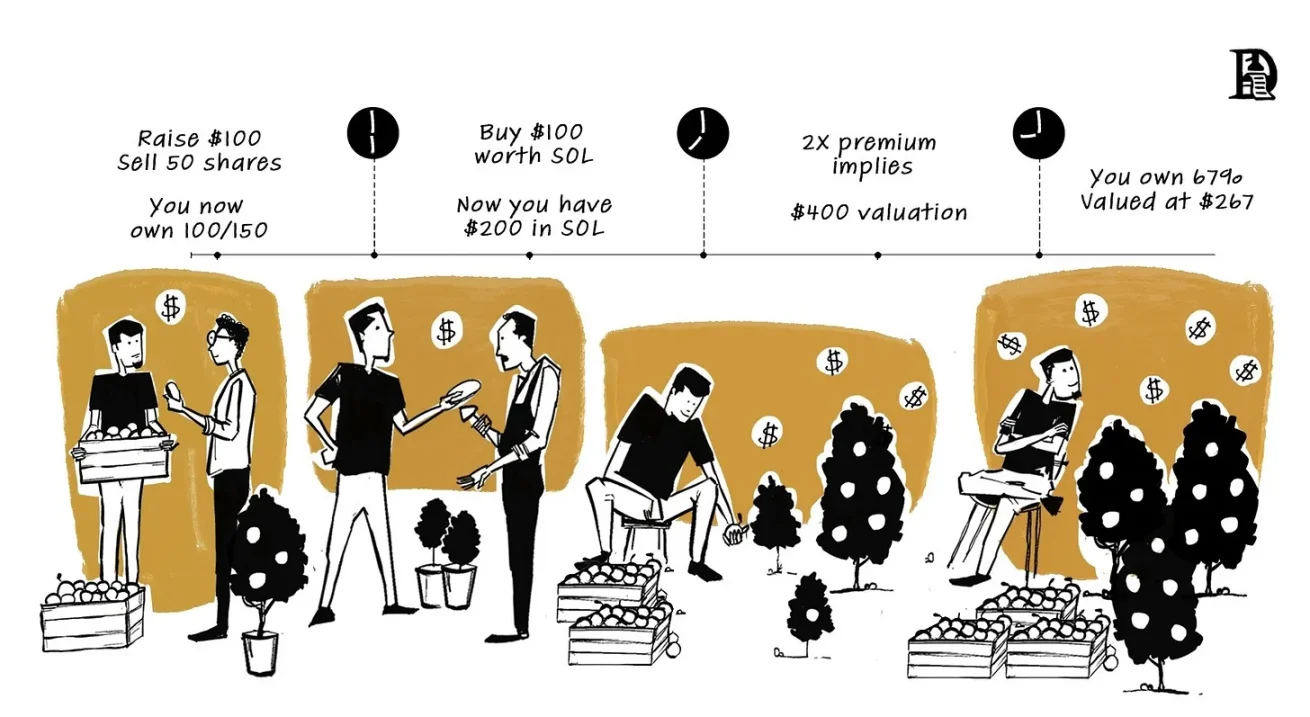 付加価値株の発行にあたり、Solana株をさらに購入するために100ドルの資金調達をしたいと考えています。純資産価値の2倍で取引されているため、100ドルの資金調達には、1株あたり2ドルで50株の新株を発行するだけで済みます。これで150株のうち100株を保有することになり、所有権は3分の2に希薄化されます。新たに調達した100ドルでSolana株をさらに購入すると、100ドル相当のSolana株の価値は2倍になり、時価総額はさらに200ドル増加します。
