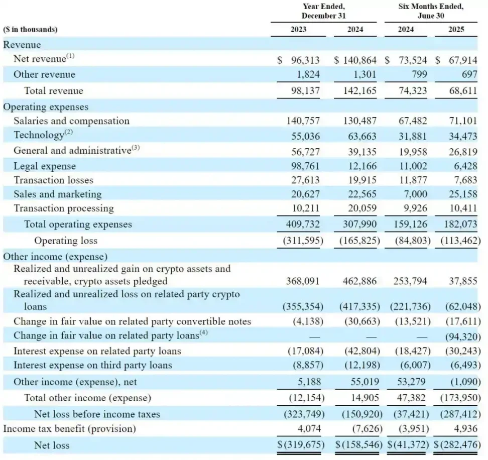 ジェミニが現在、財政難に陥っていることは特筆に値します。S-1提出書類によると、2025年6月までの6ヶ月間で、同社は収益6,860万ドルを計上しましたが、純損失は2億8,250万ドルに上り、前年同期の4,140万ドルを大幅に上回りました。取引手数料は依然として主要な収入源であり、2025年上半期の総収益の約66%を占めています。ジェミニは、カストディ、ステーキング、ステーブルコイン「ジェミニ・ドル(GUSD)」の発行などのサービスも提供しています。
