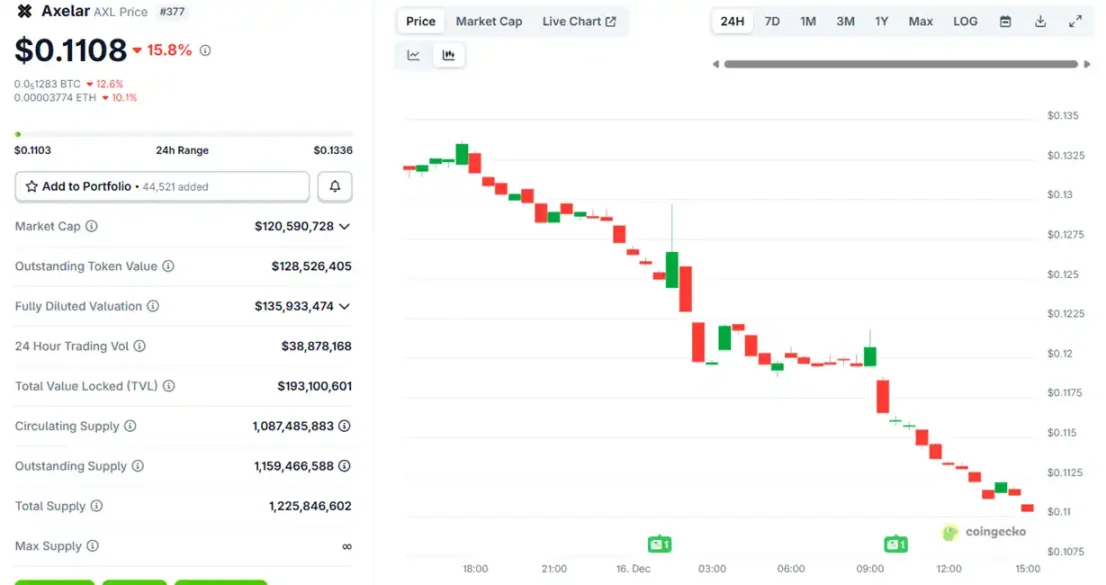 買収発表後、Axelarトークン$AXLの価格は当初わずかに上昇した後、下落し、現在は約15%下落しています。