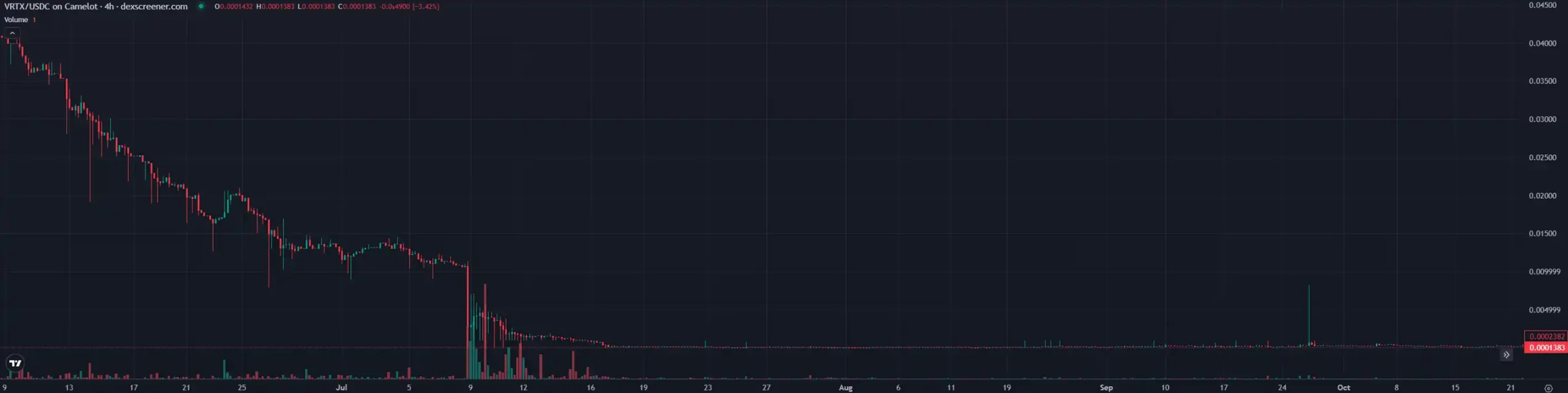 7月、Krakenレイヤー2ネットワークInkの財団は、Arbitrumベースの分散型取引所であるVertex Protocolを買収し、エンジニアリングチームと取引アーキテクチャ(同期注文帳、永久契約エンジン、マネーマーケットコードを含む)を引き継ぎました。買収後、Vertexは9つのEVMチェーンでのサービスを停止し、トークン$VRTXは廃止されました。発表後、$VRTXは初日に75%以上急落し、その後ゼロ(現在の時価総額はわずか73,000ドル)に落ち込みました。