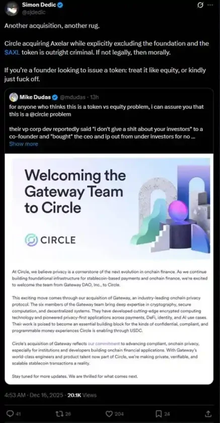 つまり、今回の取引の核心は、Axelarネットワークやそのトークンシステムの完全な買収ではなく、プライバシーコンピューティングやコンプライアンス決済の分野におけるUSDCの応用を促進するために「チームをCircleに統合する」ことにあります。Circleはチームと技術を買収したのです。Circleは当初のプロジェクトには一切関与していません。