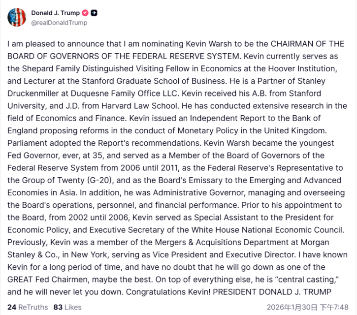 トランプ大統領はソーシャルメディアプラットフォーム「Truth Social」でこのニュースを発表し、投稿の中でケビン・ウォーシュ氏への高い評価と期待を表明した。ウォーシュ氏を長年知っており、彼が連邦準備制度理事会(FRB)議長の中でも最も偉大な、あるいは最高の議長の一人になることに疑いの余地はないと述べた。また、ウォーシュ氏のイメージと気質は、FRB議長の地位に対する国民の期待に完全に合致しており、ウォーシュ氏が国民を失望させることはないと確信していると述べた。