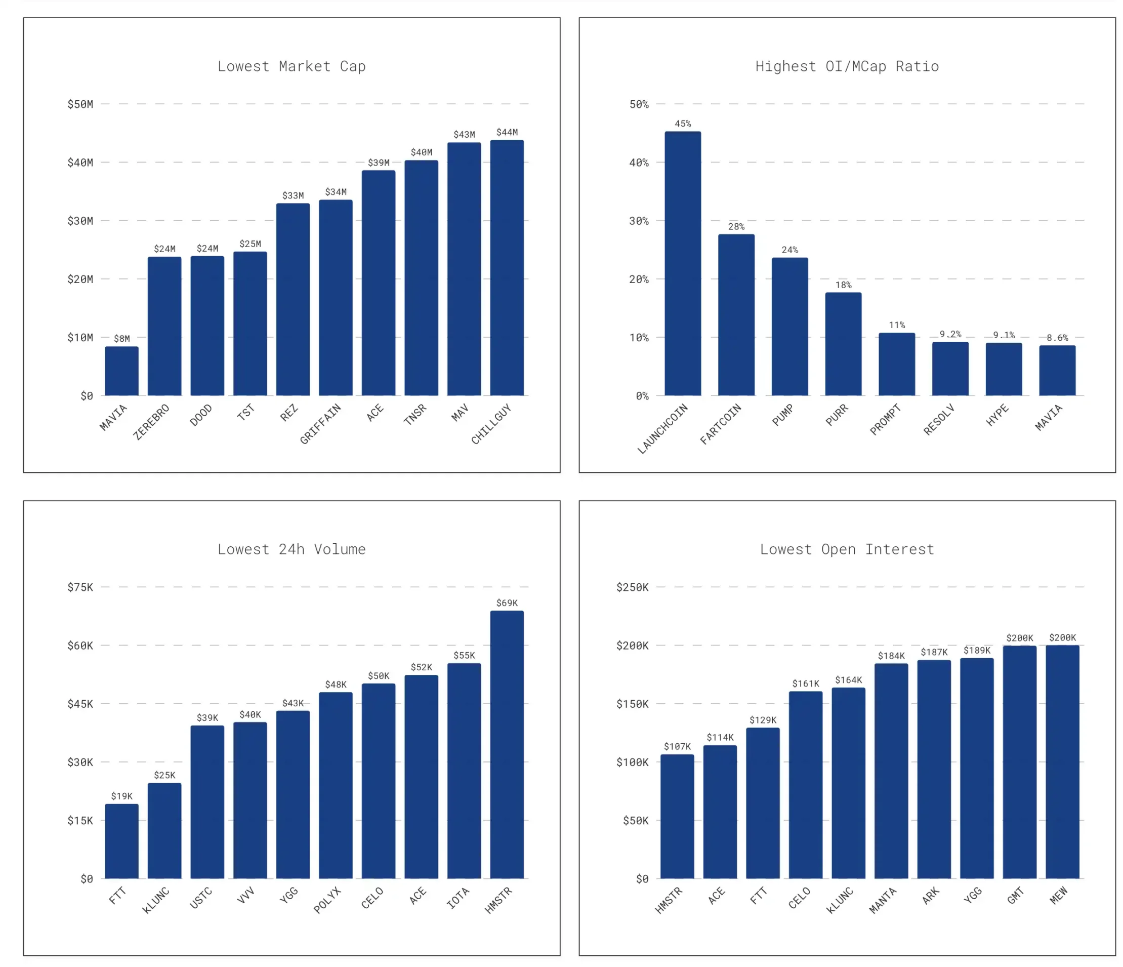 例えば、OI/時価総額比率を考えてみましょう。これは、建玉残高(OI)を時価総額で割ったもので、パーセンテージで表されます。比率が高いほど、トークンの総価値に占めるデリバティブポジションの割合が高く、資本流入の影響を受けやすいことを示します。典型的な例として、HLP清算金庫に引き継がれたポジションが挙げられます。このポジションは、ある時点でJELLYの流通供給量の40%を超えました。これにより、トークン価格はドミノ倒しのように下落し、一度押すだけで倒れてしまいました。