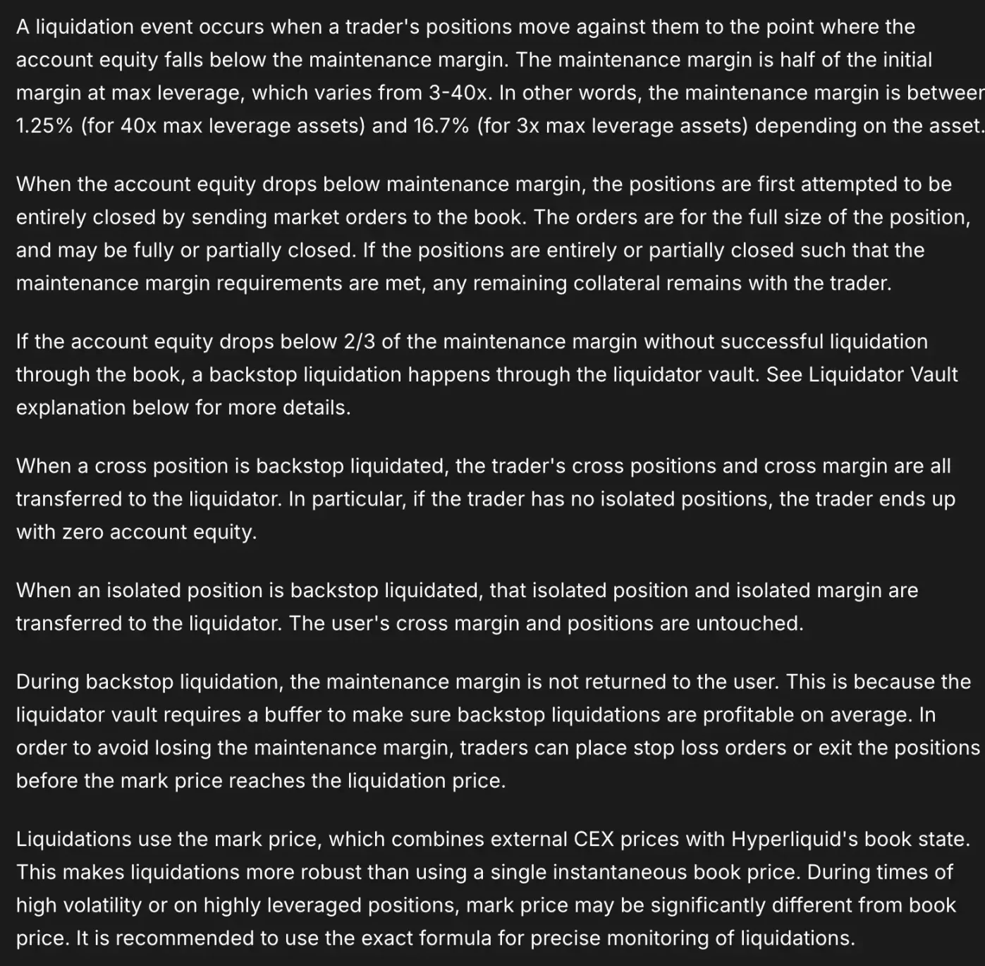 大規模なポジション(例:100,000 USDC超)の場合、通常はまず20%の清算が行われ、その後約30秒間のクールダウン期間が続きます。この清算が完了しず、状況がさらに悪化し、より高い閾値(例:エクイティが2/3 × MMを下回る)に達した場合、バックアップ清算が開始され、コミュニティベースのLiquidator Vault(HLPコンポーネント)が引き継ぎます。この保証の継続性を確保するため、このフェーズでは維持証拠金が返金されないことがよくあります。