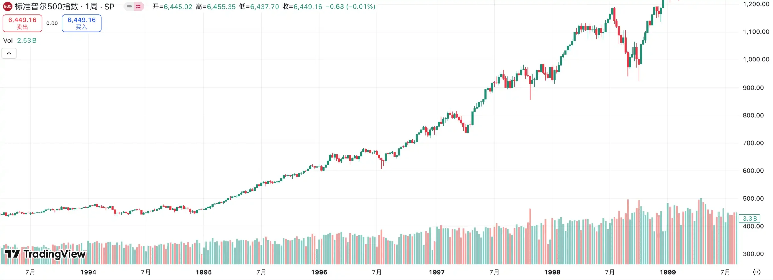 この一連の緩やかな利下げは大きな効果を発揮し、景気拡大を維持し、資本市場に熱狂をもたらしました。緩和政策開始以来、ダウ工業株30種平均は2倍以上に上昇し、100.2%上昇しました。S&P500は124.7%上昇し、ハイテクブームに牽引されてナスダックは134.6%急騰し、その後のドットコムバブルの勢いを先取りしました。