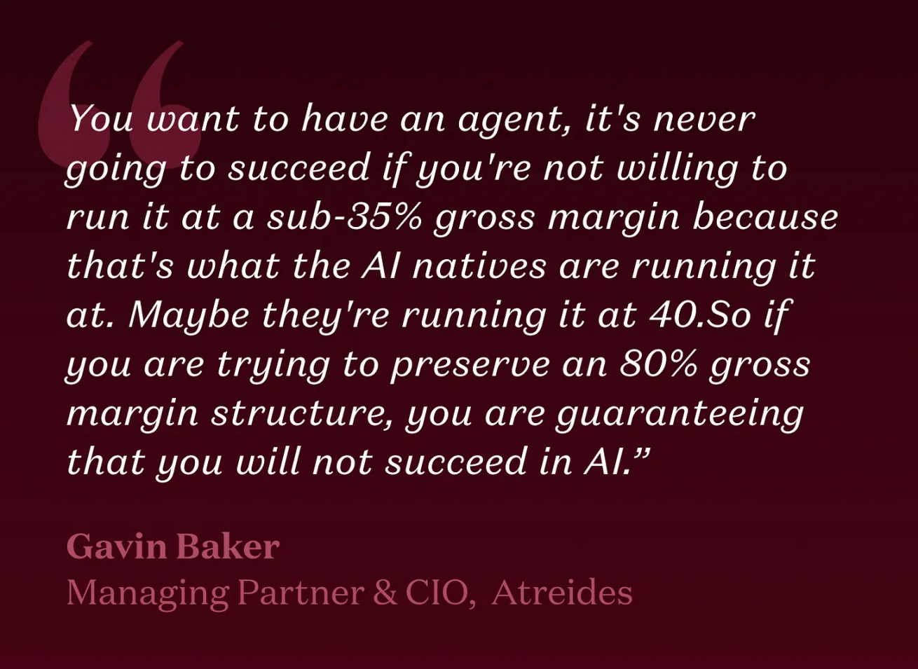 フォーチュン500企業や政府機関から100万ドル以上の受注を獲得するために、エンジニアを飛行機で現地に派遣しなければならないとしたら、多くのアーリーステージ企業は、勢いを得るために粗利益率を犠牲にする覚悟です。また、新しいAI体験にはしばしば多大な推論コストがかかるため、投資家は粗利益率の低下をますます受け入れるようになっています。重要なのは、クライアントの経営陣と信頼を勝ち取り、「結果」を提供し、それに応じた価格設定ができるかどうかです。