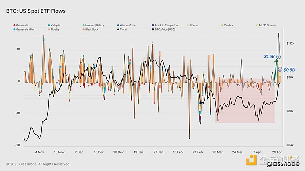 ビットコインが最近94,000ドルまで急騰した際、米国のスポットビットコインETFには1日あたり15億4,000万ドルという驚異的な純流入額が記録され、これは設定以来最高の1日あたり純流入額の1つとなった。この流入は、ビットコインの需要が回復し始めている可能性を強く示唆しています。