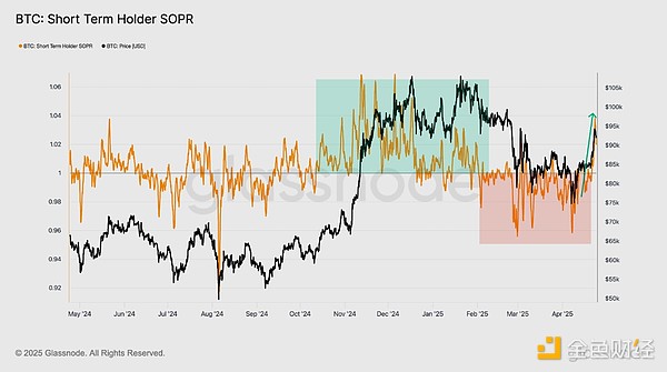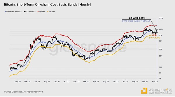 米中関税摩擦が緩和されるかもしれないという楽観的な見方から、ビットコインの価格は94,700ドルまで急騰した。価格は、弱気相場と強気相場の段階を区別する重要な中間点である短期保有者のコスト基盤を一時的に回復しました。