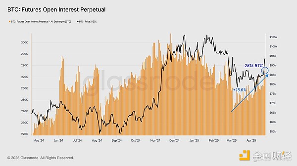 一部のスポット保有者は利益を確定しているようだが、永久スワップトレーダーは上昇局面で空売りする傾向がある。永久スワップ契約の未決済残高は281,000 BTCに急増し、3月初旬に記録した243,000 BTCの安値から約15.6%上昇した。