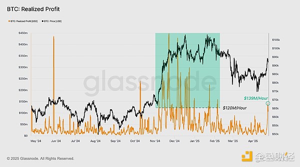 市場の枠組みが決定点に達したので、利益確定行動が監視すべき重要なシグナルになります。このソリューションによる 1 時間あたりの実現利益合計は現在 1 億 3,990 万ドル/時間に急増しており、1 時間あたりのベースラインの 1 億 2,000 万ドル/時間よりも約 17% 高くなっています。