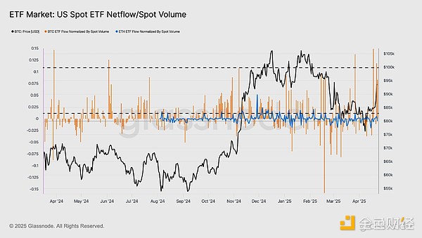 過去2週間、ビットコインETFには2つの注目すべき流入の波があり、それぞれがBTCスポット取引量の10%を超えており、機関投資家の比較的強い需要を浮き彫りにしている。