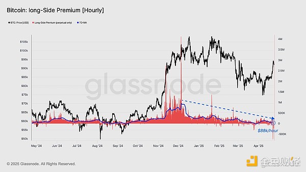 しかし、永久スワップトレーダーの長期的な感情を評価するために視野を広げると、状況はより慎重なものになります。 1 時間あたりに支払われる長期資金の 7 日間の移動平均は着実に減少しており、現在は 1 時間あたり 88,000 ドルで、依然として下降傾向にあります。