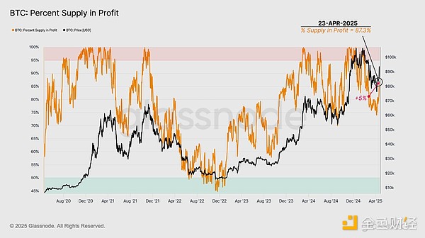 最近、市場は94,300ドルまで上昇し、同時に投資家が保有する未実現利益も大幅に増加しました。利益引当率指標は87.3%まで上昇し、3月の最低水準から急回復した。